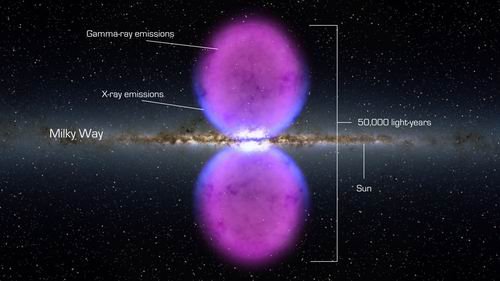 这两个气泡连接起来时其直径跨度50000光年,是整个银河系直径的一半。该结构在太阳系和银河系核心之间尽可能地延伸。由于气泡延伸在不同的平面,它们将不会包裹吞并地球。这项研究报告将发表在近期出版的《天体物理学》杂志上。
