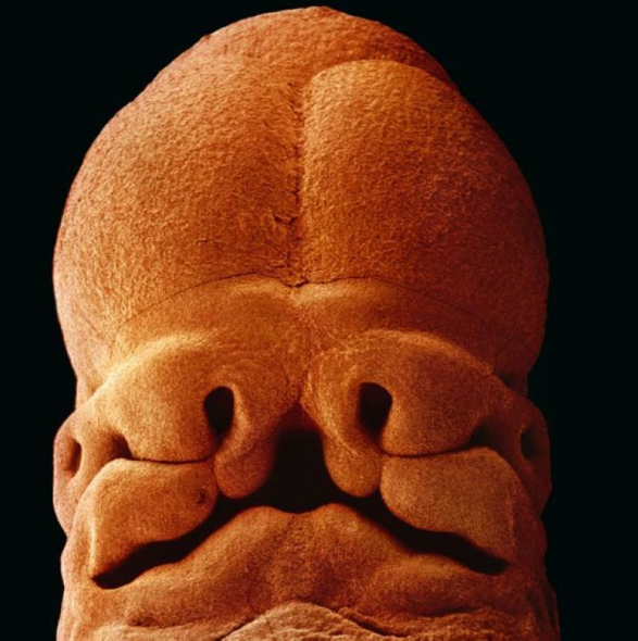 5周大的胎儿。此时的胎儿只有大约9毫米长。面部正在发育,嘴巴、鼻孔和眼睛正在形成。