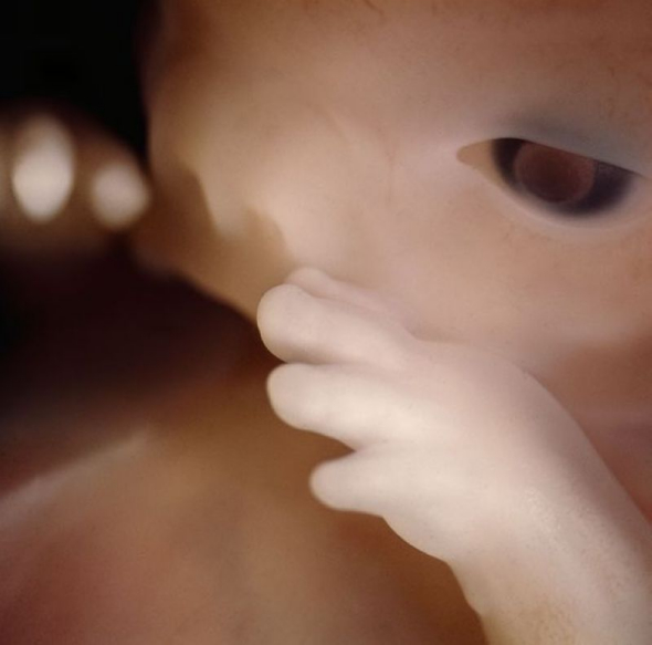 16周大的胎儿。小家伙用手探索自己的身体以及周围的环境。