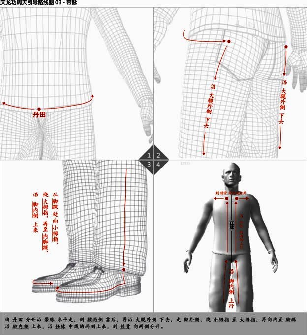 由 丹田 分开沿 大腿内侧 下去,到 脚 由 大脚趾 分开到 小脚趾 ,沿 腿外侧 上来,经 环跳穴,在 命门穴 汇合,沿 督脉 上行至 百会穴,再下行走在 眉心,分开由 眼眶,鼻子 和 嘴外侧 下来,再在 嘴下 会合,下行到 丹田。