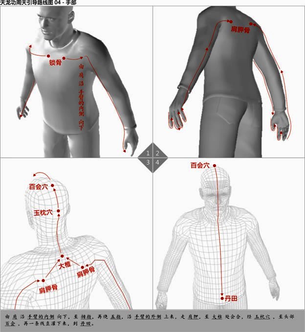 由 肩 沿 手臂的内侧 向下,至 拇指,再绕 五指,沿 手臂的外侧 上来,走 肩胛,在 玉枕穴 汇合,至头部 百会 ,再一条线直灌下来,到 丹田。